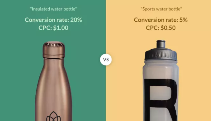 Conversion rate, click-through rate, and click-per-cost vary from three placements. It is recommended to adjust the bid by placement.When raising or lowering the keyword bid, you can change not only the advertising ranking but also the advertising placement.After lowering the bid, your AD may show more on the product detailed page. Competition and CPC are lower on the product detailed page, as well as conversion rates, which may cause high ACOS.4. Keyword DiversityWhen using the automatic campaign or broad match, ads will bid on various search terms.For example, when bidding for “water bottle” with a broad match, the CPC is $1, and the target ACOS is 50%. AD will bid on keywords like “sports water bottle” and “insulated water bottle” due to broad match.We assume that the conversion rate of “insulated water bottle” is 20% and the CPC is $1; the conversion rate of “sports water bottle” is only 5%, and the CPC is $0.5.